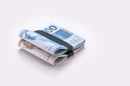 wad of money from brazil, thousand reais in wad of money, 100 reais banknote, grand prize, copyspace, white background