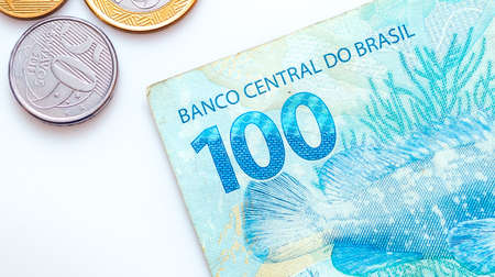 Money of Brazil. Brazilian real bills. BRL banknotes. 10 reals. Business, finance, news background.