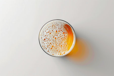 Top view of a glass full of refreshing beer with bubbles, isolated on a white background
