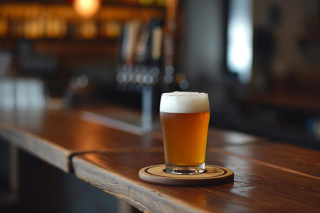 A cold glass of beer on a pub counter, with warm lighting and soft bokeh in the background.