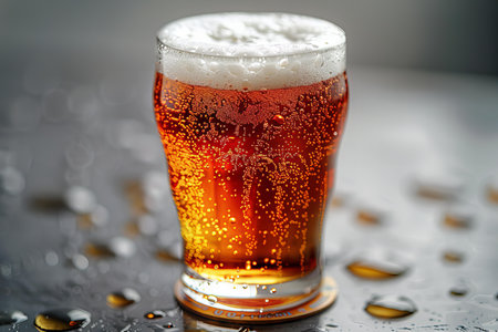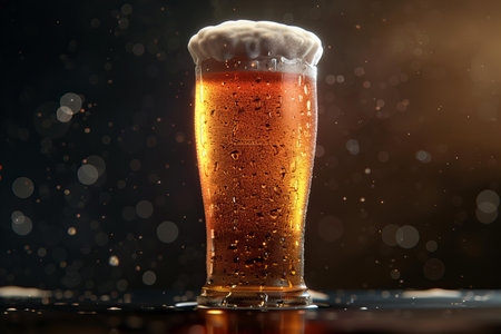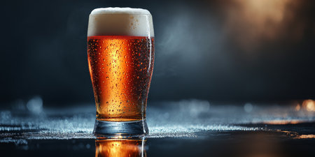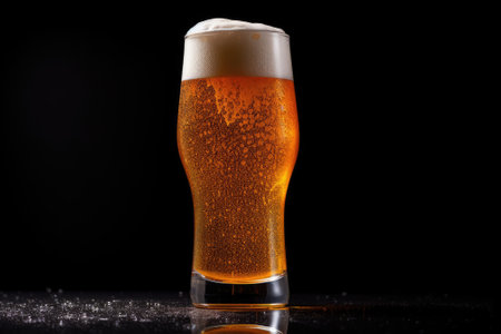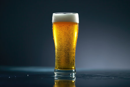Refreshing tall glass of beer with frothy head on a wet surface, studio shot showcasing cool drink