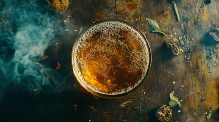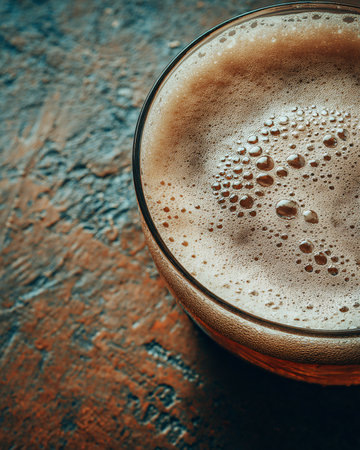 A captivating top view of a refreshing glass of amber beer, with foam and bubbles creating an inviting atmosphere on a rustic wooden table. Perfect for celebrations!
