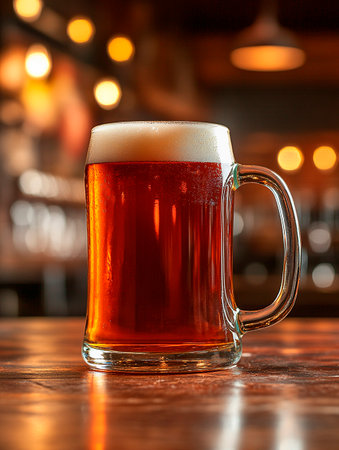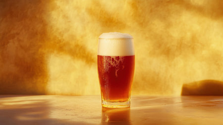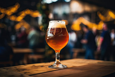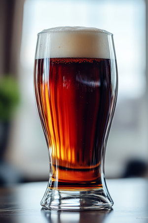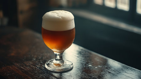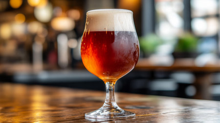 A stunning craft beer served in an elegant glass, showcasing rich amber hues with frothy foam. Perfect for social gatherings or restaurant settings.