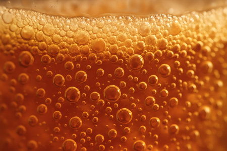 A perfectly poured glass of beer showcases a rich, foamy top with vibrant bubbles rising through the amber liquid. The intricate texture of the foam contrasts beautifully with the warm colors of the drink, creating an inviting atmosphere ideal for relaxation and socializing during an evening gathering.