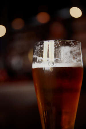 Glass of beer on a table in a bar on blurred bokeh background.
