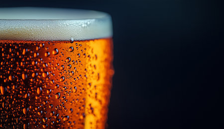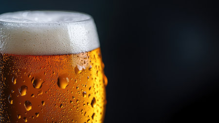 Close up of beer glass with water droplets, offering ample space for convenient text arrangement