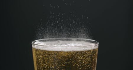 foam beer poured into a glass on a black background with copy space