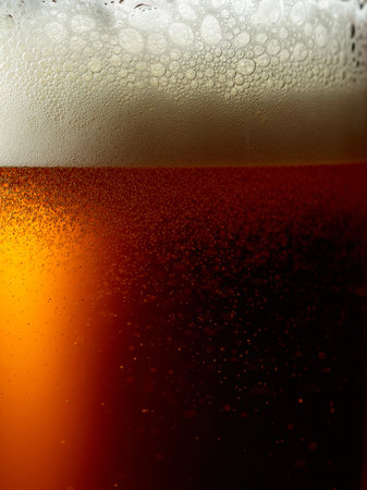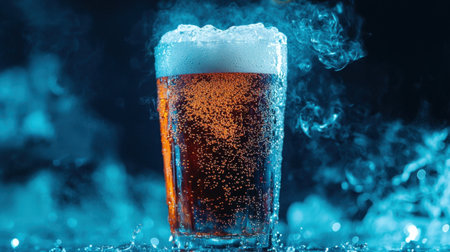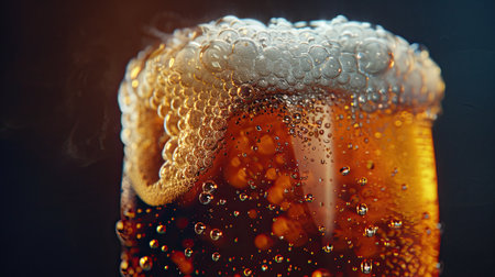 A stunning close-up of a glass filled with brown beer with frothy foam and exciting bubbles illuminated by cool lighting, creating an inviting and refreshing atmosphere.