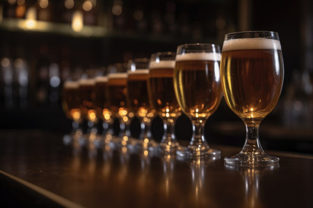 Glasses of beer on the bar counter in a pub or restaurant, Stylish beer glasses full of beer on the bar stand, AI Generated