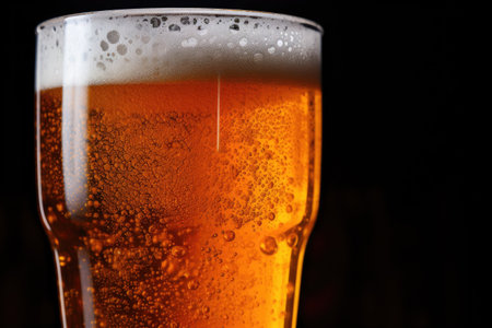 Close-up of frothy beer glass against dark background