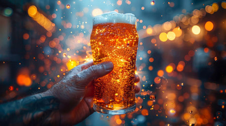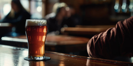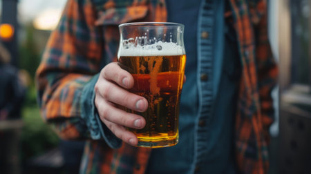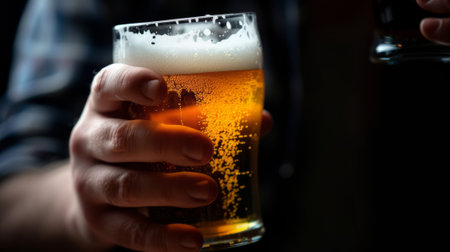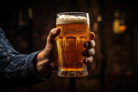 Man holding a glass of amber ale beer with a foamy head in a bar or pub. Refreshing beverage for a social gathering.