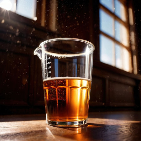 A beautifully lit beer glass sits on a rustic table, with sunlight reflecting off its amber surface, capturing the essence of a refreshing summer day outdoors.