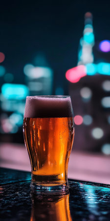 Vibrant Nightlife Scene with Illuminated Cityscape and Refreshing Beer Glass.