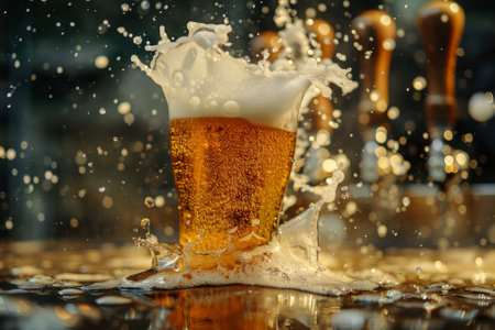 A glass of beer is poured into a cup, and the foam is spilling out of the cup. Concept of fun and enjoyment, as the foam is splashing and spilling out of the cup, creating a playful