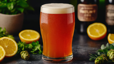 A frothy glass of amber beer surrounded by fresh herbs and citrus fruits, creating a refreshing and vibrant beverage scene.