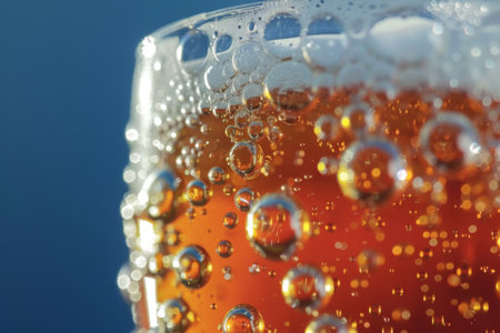 A close-up view reveals tantalizing bubbles swirling in a glass filled with a golden amber drink, reflecting sunlight, and creating an inviting atmosphere perfect for summer enjoyment.