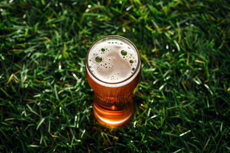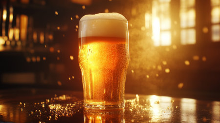 A chilled glass filled with golden beer shimmers with bubbles and foam, creating a refreshing scene that captures the essence of relaxation and enjoyment.