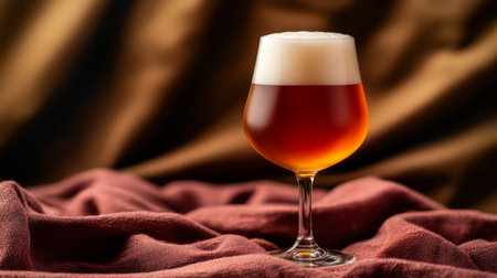 This captivating image features a beautifully crafted glass of amber beer adorned with a frothy head, set against a soft fabric backdrop, evoking a warm, inviting atmosphere.