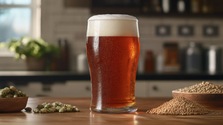 A refreshing glass of amber beer sits proudly on a wooden table, surrounded by barley and hops, embodying the essence of craft brewing and leisure enjoyment.