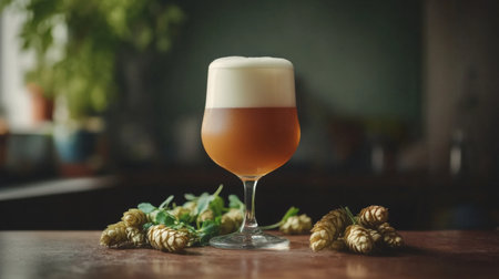 A beautifully crafted glass of beer topped with foamy head rests on a rustic wooden table, surrounded by fresh hops, showcasing the essence of craft brewing.