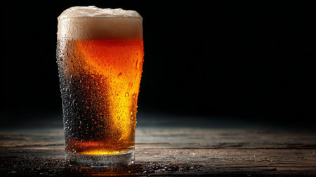 A chilled glass of amber beer decorated with foam sits on a wooden table against a dark background, perfect for illustrating beverage enjoyment and hospitality themes.