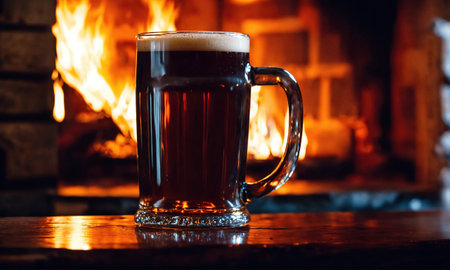 Dark beer glass with frothy head and steam on a warm orange background, perfect for cozy gatherings and celebrations