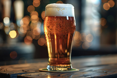 glass of beer on wooden table in pub with bokeh background