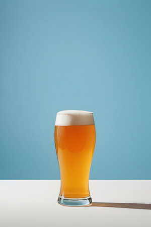 Glass of beer on a white table and blue background. Studio shot.
