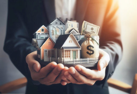 Real estate agent holding the coin with growing tree and house model on the pile of home loan concept coins. Finance and Mortgage Home Security and Real Estate Insurance