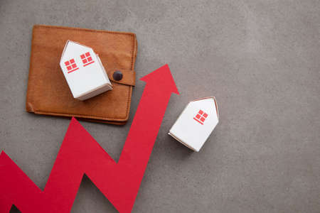 Money in international currency, including euro, dollar, a coin on which there is a toy house. The concept of mortgages, investments, loans, debts, housing purchases: apartments or houses