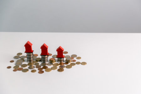Coin stacks and house model, mortgage and real estate investment, for saving or investment for a house.