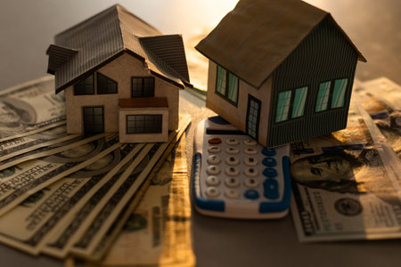 money, dollars, white calculator, toy house concept of buying and maintaining a house, apartment, credit relations, loan0,
