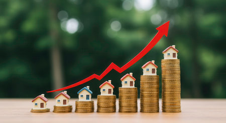 Rising real estate market concept. Miniature houses on stacks of coins with an upward trending arrow, illustrating property value growth.