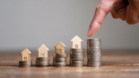 Stacked coins with miniature houses representing real estate investment. Generative AI