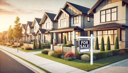 Pole sign with a for sale text with a real estate background. Real estate sales concept