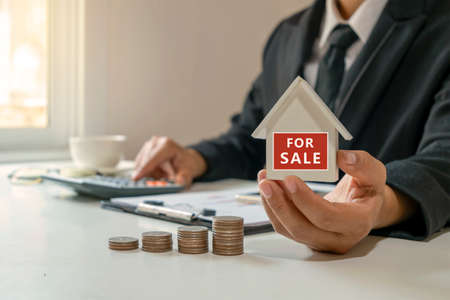 Businessman holding house model with message for sale on home investment ideas buying real estate and home equity loans.