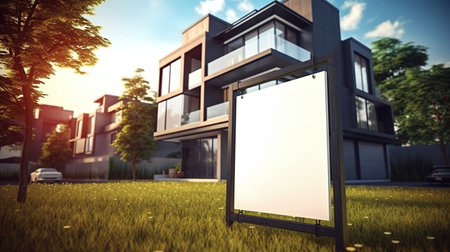 Successful real estate agent in a suit holding for sale sign near new apartment. Real estate agent with home loan contract, selling home. Realtor or real estate agent shows board for sale.