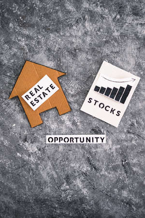 investment opportunities and building wealth conceptual image, house icon next to stock market stats with text underneath
