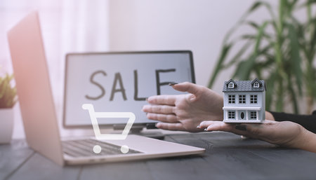 Man using laptop searching for real estate or new house on the internet with for sale sign on red house