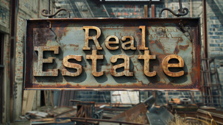 Real estate for sale sign in front of residential home, property market, house buying, selling concept, suburban neighborhood background.