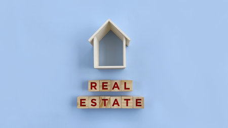 Real Estate Symbol. House miniature with the words Real Estate. Conceptual words. Real estate market. Beautiful blue background, copy space