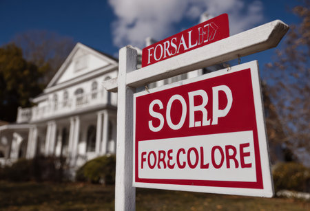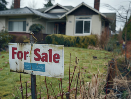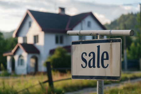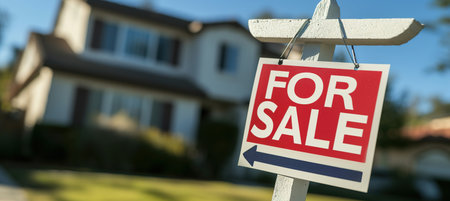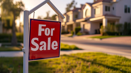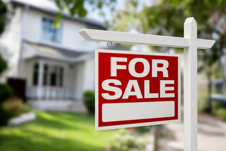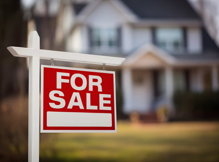 A red and white For Sale sign is displayed outdoors, attracting potential buyers. The sign features bold lettering against a contrasting background. A white residential house with multiple windows is slightly blurred in the background, suggesting a real estate context. The scene is illuminated by natural light, potentially suitable for promotional or editorial uses.