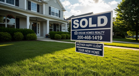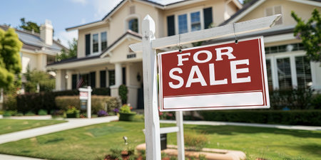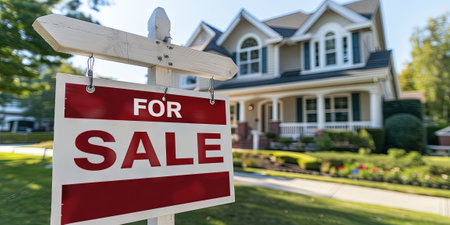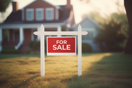 For sale sign near american family house in suburban neighborhood. Real estate market. Created with Generative AI