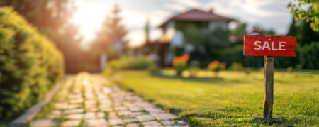 House for sale sign on pathway to a suburban home, sunlit garden and lawn. Real estate and home buying concept