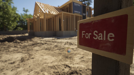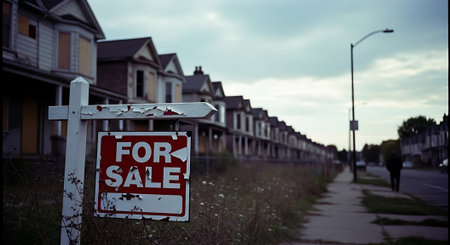 A prominent yellow sign displaying For Sale stands in front of a row of modern suburban homes. The houses are well-designed showcasing a blend of contemporary architecture.