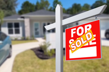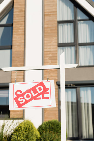 Front facade of modern house near lawn and sign with sold lettering, banner