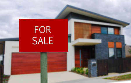 A for sale sign stands prominently in the foreground, with a large residential house blurred in the background. The sign features bold red and white colors and clear lettering. The image has an outdoor setting, potentially during the day, suitable for various real estate and property-related uses.