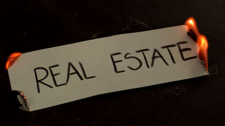 Real estate word written on white paper burns. Fire with smoke and ashes on black background