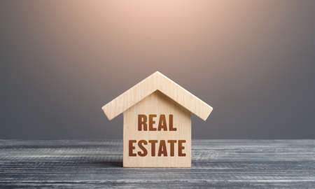 Wooden figurine of a house with word Real Estate. Buying and selling. Housing, realtor services. Construction industry, building maintenance. Mortgage loan. Assets and tax payments. Stamp duty