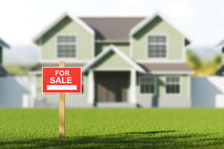 FOR SALE red sign on a green clearing against the background of a house for sale